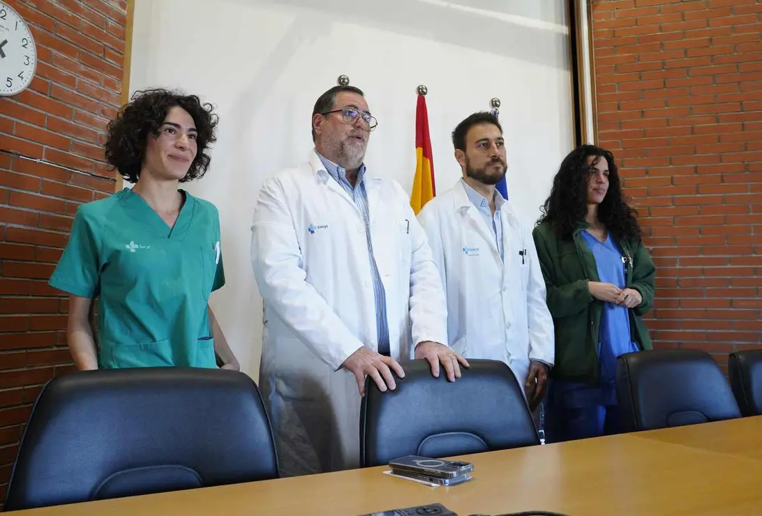 El gerente de Asistencia Sanitaria del Bierzo, Juan Ortiz de Saracho (2I), junto al coordinador de cirugía robótica del Hospital de El Bierzo, Óscar Miranda (2D), y las enfermeras del servicio de Urología, Paula Fernández (I), y Meritxell Fornel (D), durante su comparecencia para informar sobre el éxito de las primeras operaciones con el robot Da Vinci. Foto: César Sánchez