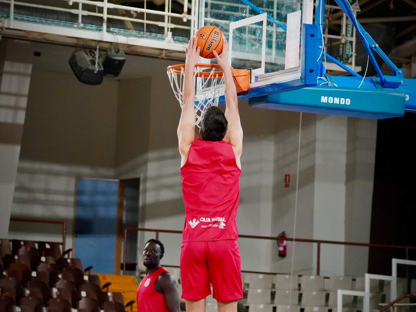 El primero hace la corbata y sale fuera. El segundo muy largo y golpea en el aro. Rebote para Jaime Llamas