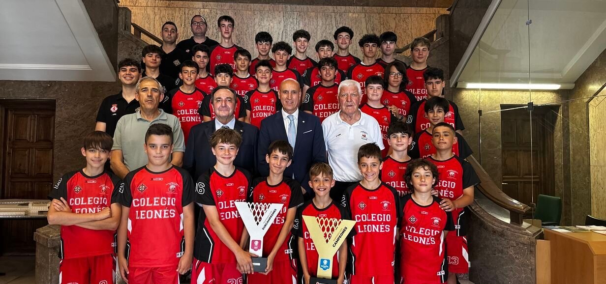 El alcalde de León, José Antonio Diez, y el concejal de Deportes, Vicente Canuria, han recibido este martes en el Ayuntamiento de San Marcelo de la capital leonesa a los jugadores de las categorías alevín e infantil masculino de baloncesto del Colegio Leonés.