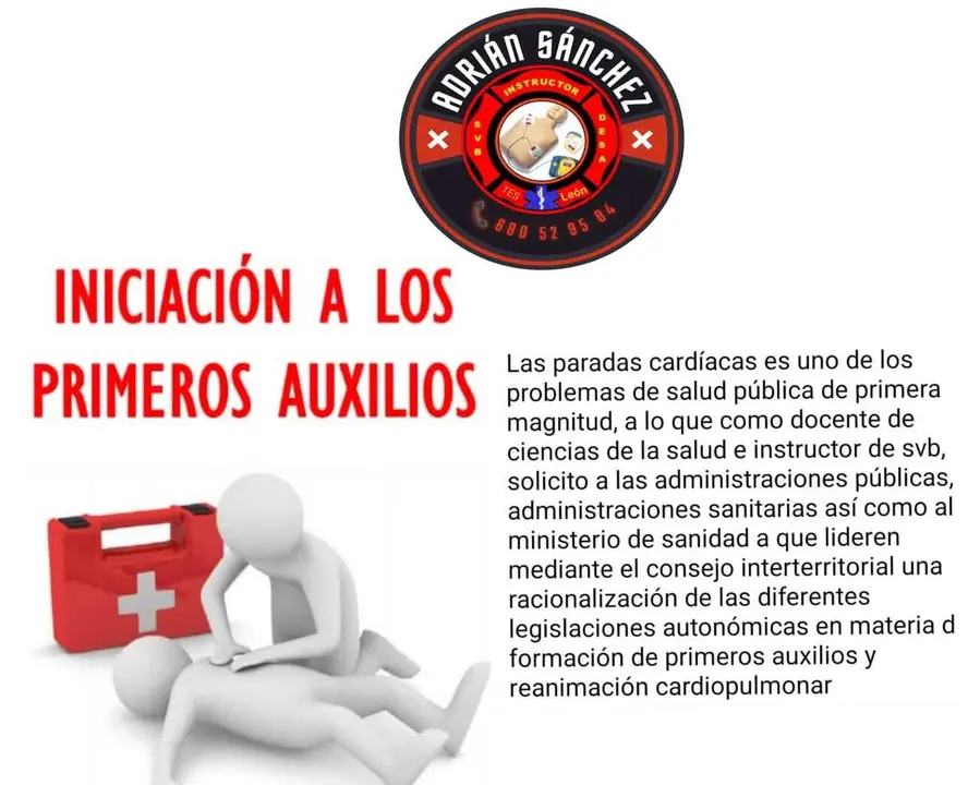 En calidad de Instructor de cursos formativos de SVB y DEA de la asociación Avan León como miembros colaboradores del consejo español de resucitación cardiopulmonar(Cercp) así como director e instructor de cursos formativos de SVB y DEA del Plan Nacional de RCP y Semicyuc en Eyrsal Emergencias y León Formación, quiero comunicar que se inste a las diferentes administraciones públicas ,sanitarias, ministerios de educación y FP y ministerio de sanidad a que lideren mediante el consejo interterritorial una racionalización de las diferentes legislaciones autonómicas en materia formativa de primeros auxilios y reanimación cardiopulmonar tanto para la ciudadanía de nuestra provincia de León así como para los diferentes centros educativos y escolares, ya que a día de hoy las paradas cardiacas es uno de los problemas de salud pública de primera magnitud.