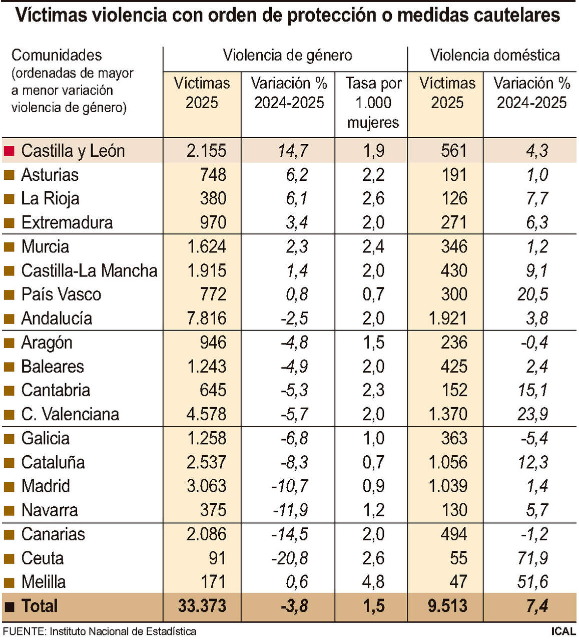 Castilla y León fue el pasado año la comunidad que registró un mayor aumento del número de víctimas de violencia de género con ordenes de protección, con un 14,6 por ciento, hasta las 2.155. Este incremento contrasta con la bajada del conjunto de España en un 3,7 por ciento, que contabilizó un total de 33.373, según datos de un estudio del INE recogidos por Ical.