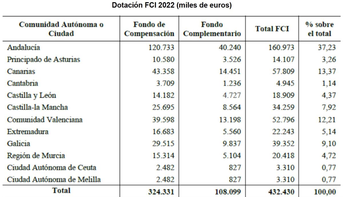 En términos absolutos, Andalucía fue la Comunidad que recibió mayor importe 160,9 millones (37,2 por ciento), seguida de Canarias, 57,8 millones (13,4 por ciento), la Comunidad Valenciana, 52,8 millones (12,2 por ciento) y Galicia, 39,3 millones (9,1 por ciento). La que experimentó el mayor aumento interanual fue Galicia, un 2,8 por ciento más, y la que tuvo la mayor disminución fue la Valenciana con una variación negativa del 1,88 por ciento.