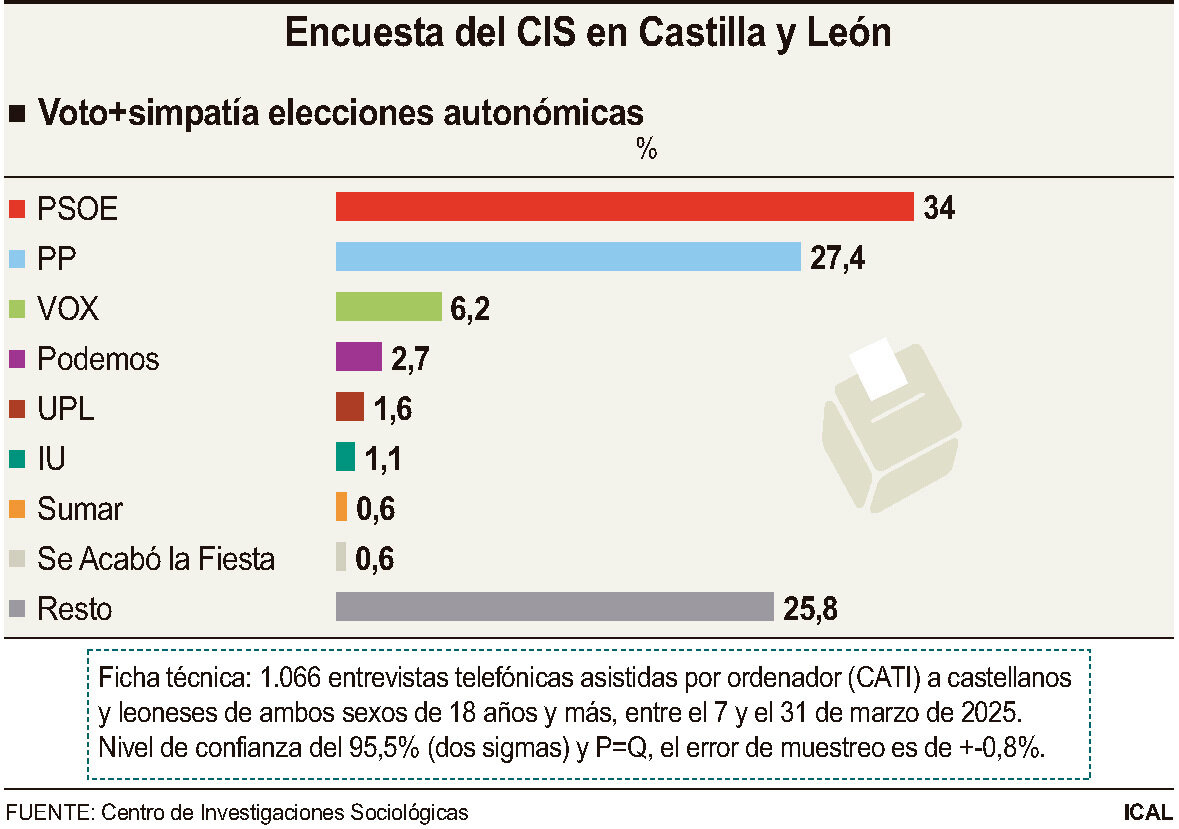 Estos datos tienen en cuenta tanto la intención directa de voto a los partidos como la simpatía por unos u otros que el CIS aplica a los indecisos para analizar los posibles resultados de las próximas elecciones autonómicas que, de no convocarse de manera anticipada, se celebrarán en Castilla y León durante el invierno de 2026.