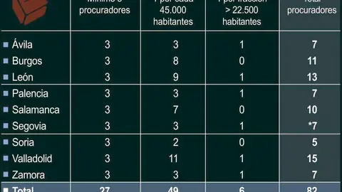 Con ello los 82 procuradores se distribuirán de la siguiente forma: 15 para Valladolid; 13 para León; once para Burgos; diez para Salamanca; siete para Ávila, Palencia, Segovia y Zamora, y cinco para Soria.