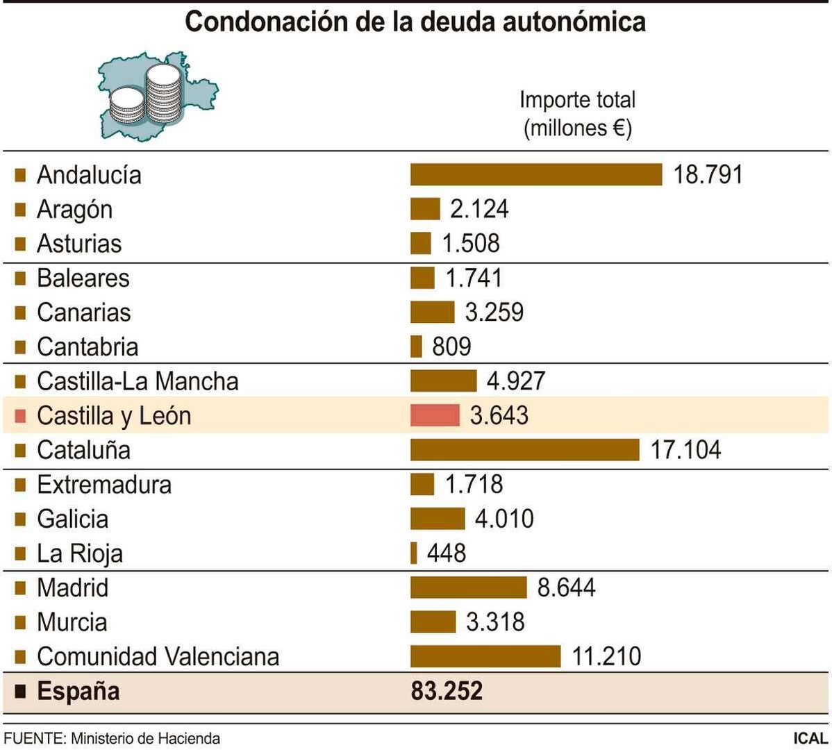 Esto supone que el Estado condonará la deuda del 26,27 por ciento de Castilla y León tras la aplicación de la fase 1, la única que afecta a la Comunidad, que no se verá beneficiada ni por las fases 2 ni tres, según la metodología elegida por el Gobierno y que se analizará en el Consejo de Política Fiscal y Financiera del miércoles. Así, da un saldo de 1.369 euros por habitantes.