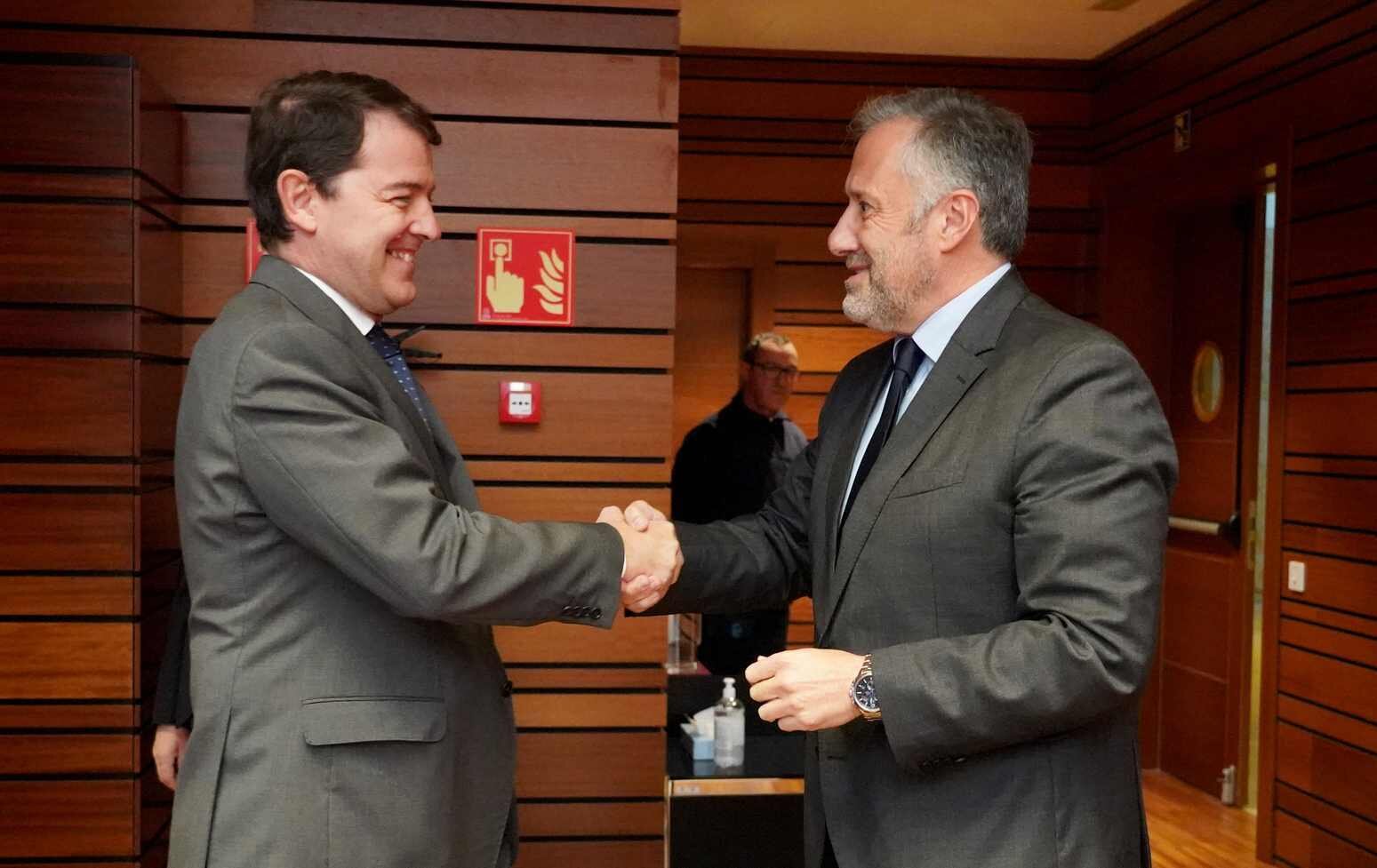 El presidente de la Junta, Alfonso Fernández Mañueco, saluda al presidente de las Cortes, Carlos Pollán, a su llegada al hemiciclo para el Pleno de las Cortes de Castilla y León