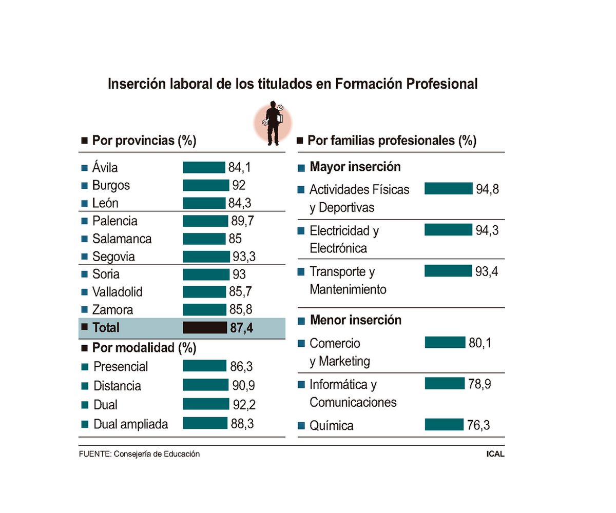 La tasa de inserción laboral subió en prácticamente todas las familias profesionales, destacando los porcentajes que alcanzan los egresados de ciclos de las familias profesionales de Energía y Agua, Edificación y Obra Civil y Seguridad y Medioambiente, con una inserción total. Ligeramente por detrás, se situaron los ciclos de Actividades Físicas y Deportivas (94,8 por ciento), Electricidad y Electrónica (94,3 por ciento), Transporte y Mantenimiento de Vehículos (93,4 por ciento), Fabricación Mecánica (93,3 por ciento), Madera, Muebles y Corcho (92,4 por ciento) y Sanidad (90,2 por ciento). Ninguna de las familias implantadas en Castilla y León arrojó tasas de inserción inferiores al 76 por ciento.