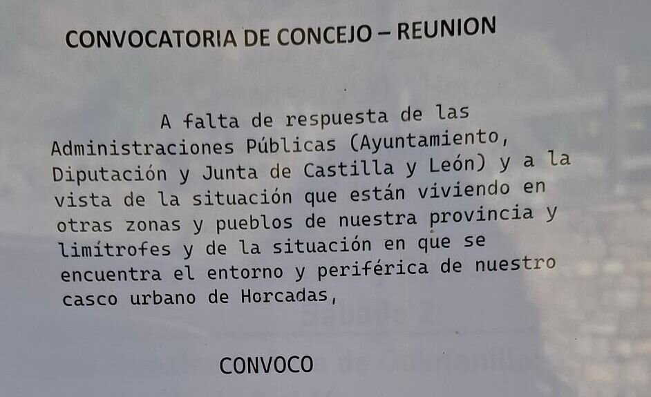 Así, Fernández no ha dudado en realizar la llamada a concejo, vía bando, explicando que "ante la falta de respuesta de las Administraciones Públicas (Ayuntamiento, Diputación y Junta de Castilla y León) y a la vista de la situación que están viviendo en otras zonas y pueblos de nuestra provincia y limítrofes y de la situación en la que se encuentra el entorno y periférica de nuestro casco urbano en Horcadas (sic)", se convoca "a todos los vecinos a una reunión para analizar y tomar las decisiones que se consideren más oportunas y más urgentes en relación a las acciones a realizar para mitigar todo lo posible el peligro del fuego en las viviendas y casco urbano en general".