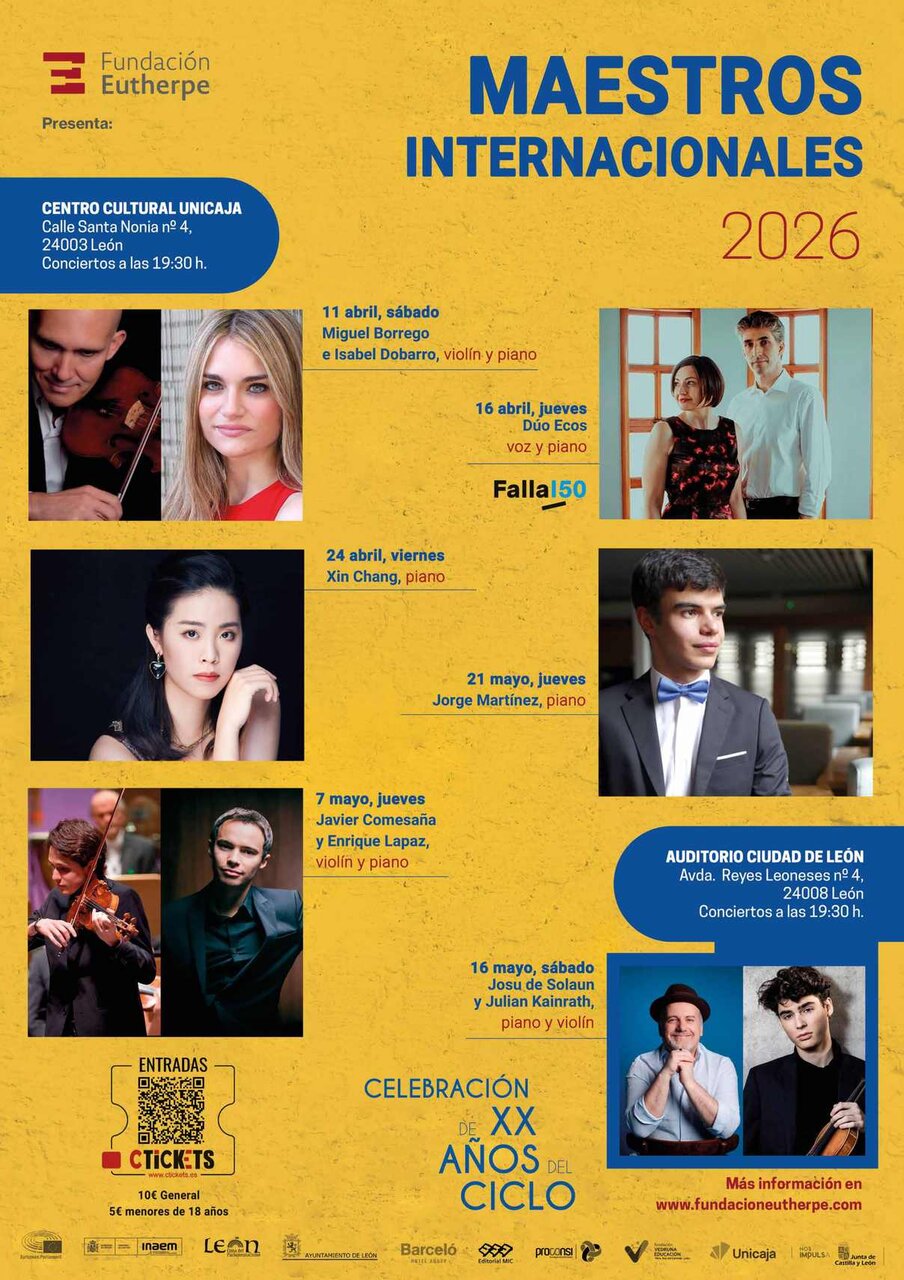 La Fundación Eutherpe ha presentado el cartel de la vigésima edición del ciclo “Maestros Internacionales”, una propuesta musical que se desarrollará durante los meses de abril y mayo de 2026 en el Centro Cultural Unicaja, situado en la calle Santa Nonia.
