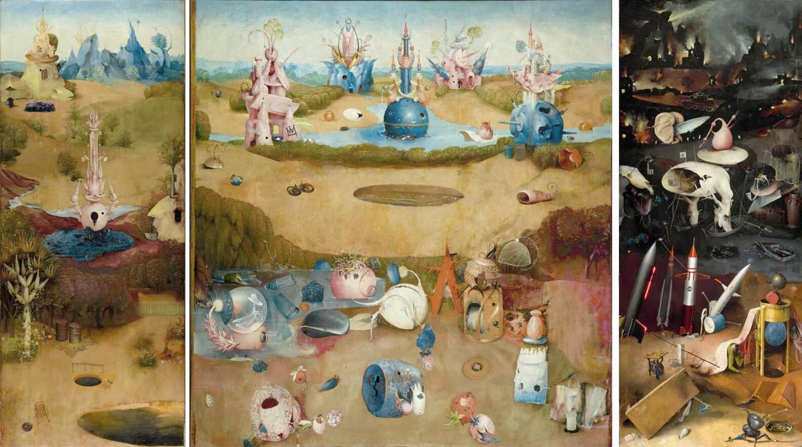 Frutas gigantes en descomposición, ríos convertidos en vertederos, estructuras corroídas y suelos agrietados componen un paisaje que evidencia cómo “la industria, la guerra y la indiferencia han sustituido la vida por su residuo”. La ausencia de figuras humanas refuerza la denuncia silenciosa: no queda nadie para habitar el jardín.