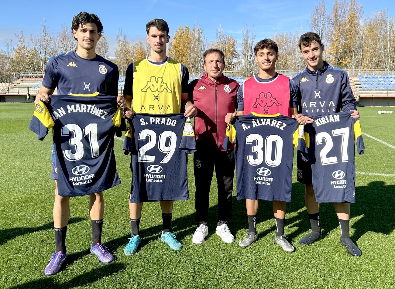 Cuatro jugadores del filial de la Cultural y Deportiva Leonesa, Ian Martínez, Santi Prado, Adri Álvarez y Kirian, han recibido sus camisetas del debut con el primer equipo de la Cultural firmadas por sus compañeros.