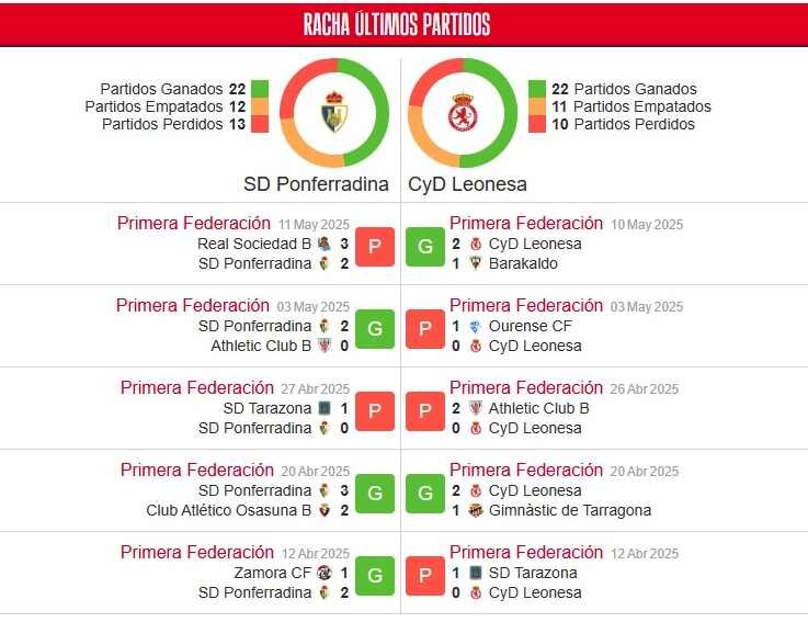 La Ponferradina, por su parte, aún sueña con el campeonato. Aunque tiene una desventaja de cinco puntos con respecto a la Cultural, una victoria en el derbi —especialmente si es por más de un gol, para anular el 2-0 de la ida— le permitiría llegar a la última jornada con opciones reales de ser campeona y de recuperar el puesto de ascenso directo.