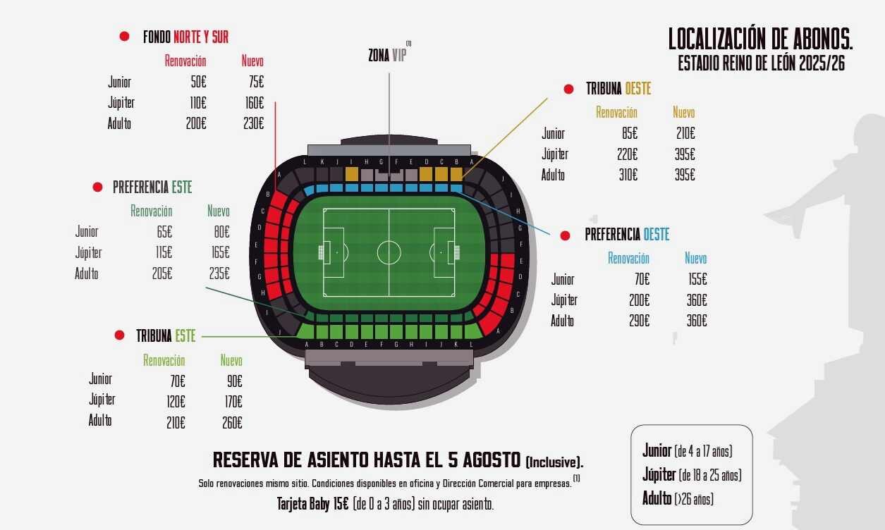 La campaña comenzará este martes 8 de julio, tanto de forma presencial como online. Los aficionados podrán acudir a las oficinas del estadio Reino de León, de lunes a viernes en horario de 10:00 a 14:30 y de 15:00 a 17:00, siempre con cita previa.