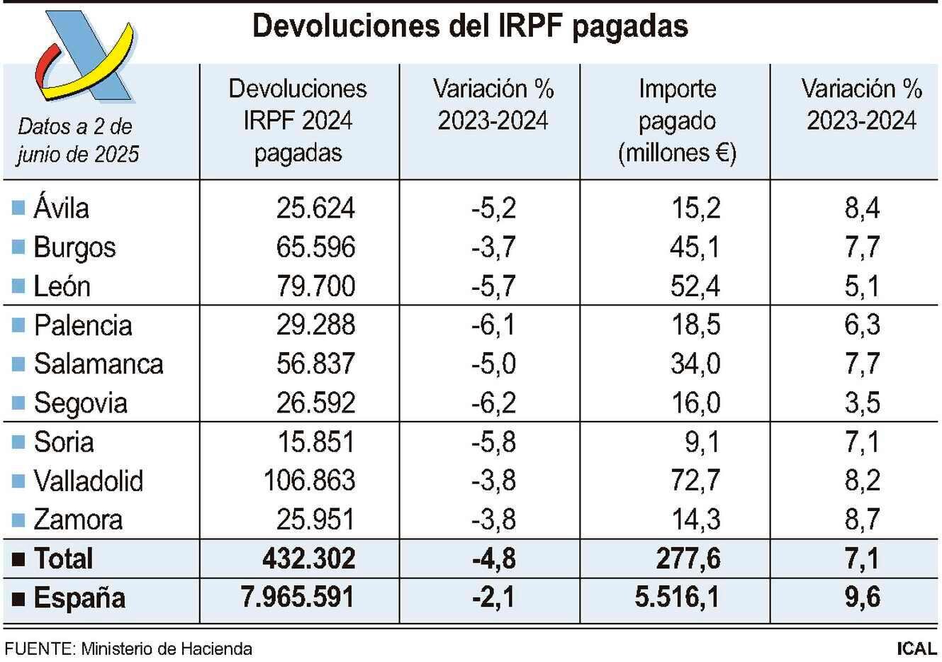 La Agencia Tributaria ha abonado ya la devolución de 277,6 millones de euros a 432.302 contribuyentes de Castilla y León superados los dos primeros meses de la campaña de declaración del Impuesto sobre la Renta de las Personas Físicas correspondiente a 2024 (IRPF 2024), de manera que se han abonado ya el 72,4 por ciento de las solicitudes de devolución realizadas y el 58,6 por ciento de los importes a devolver que se han solicitado.