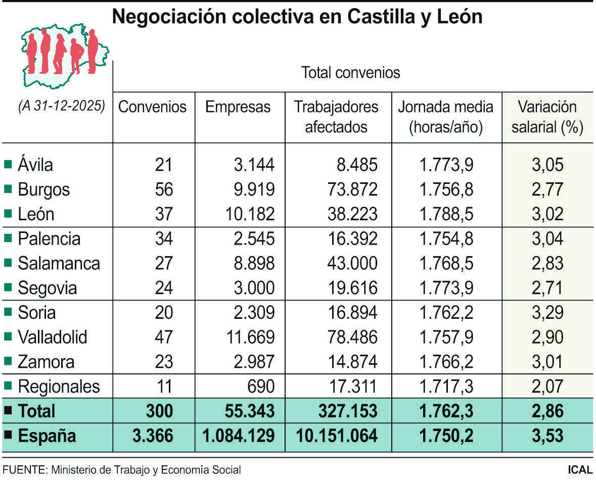El Ministerio de Trabajo y Economía Social constata que la subida salarial media pactada en esos convenios colectivos se situó en Castilla y León en el 2,86 por ciento, muy por debajo del 3,53 por ciento de la media nacional. Por el contrario, la jornada media pactada en la Comunidad, se situó en esos acuerdos en las 1.762,28 horas, cuando la media en el conjunto de las autonomías fue de 1.750,21. En total, había registrados 300 convenios, para 55.343 empresas y 327.153 trabajadores.