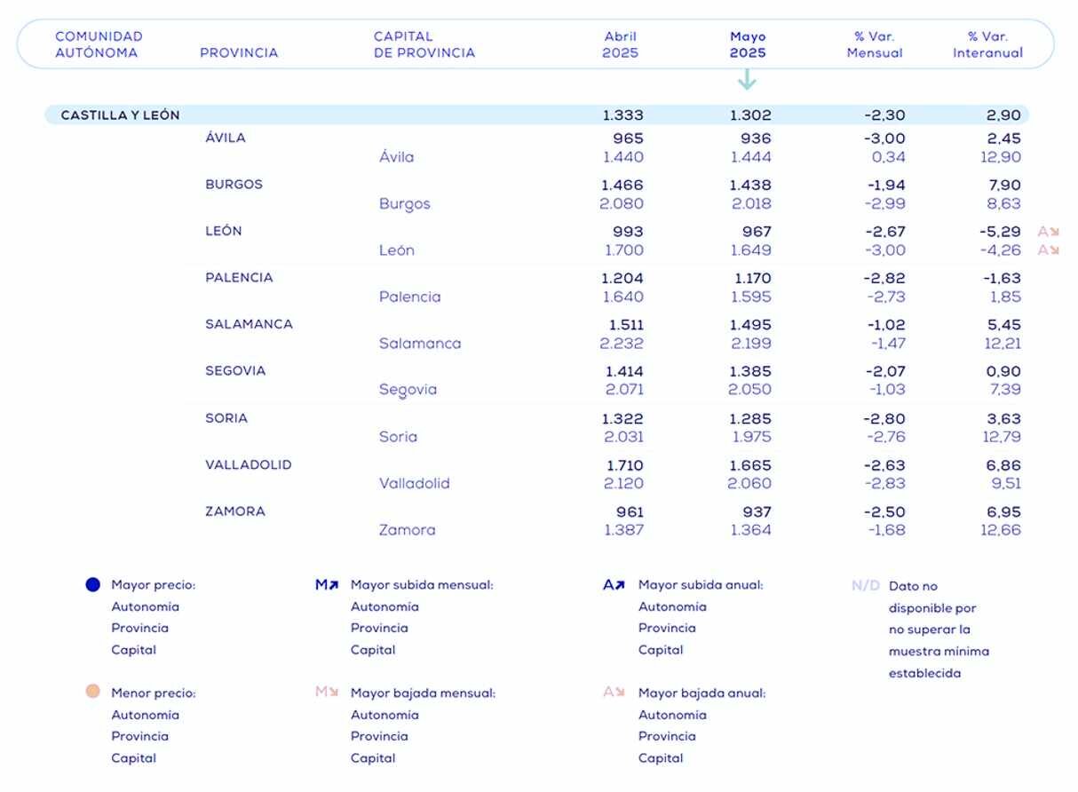 En concreto, la capital ve reducir sus precios hasta los 1.649 €/m² de media, lo que supone un descenso del 3% respecto al mes de abril y del 4,26% en el último año. La ciudad registra así la mayor bajada interanual de todas las capitales de provincia en Castilla y León, pero también es el descenso más abultado de toda España.
