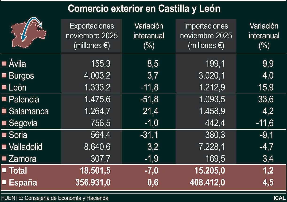 En el lado contrario, Salamanca destacó por el crecimiento de sus exportaciones, con un aumento del 21,4%, mientras que Soria registró una caída del 31,1%.