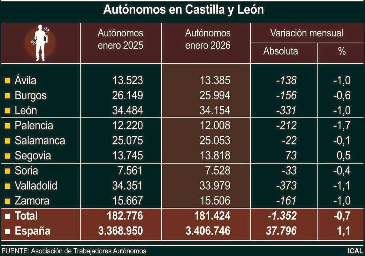 Además de León, todas las provincias de la Comunidad presentan cifras negativas, con descensos especialmente significativos en Valladolid, que pierde 265 autónomos en enero, y en términos relativos en Soria (-1,2%) y Palencia (-1%).