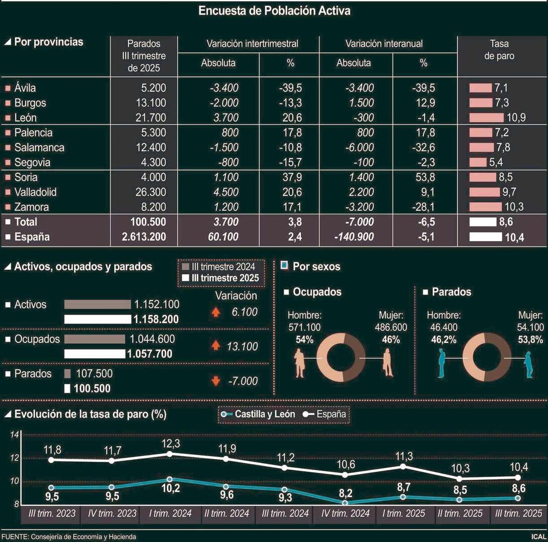 A nivel autonómico, Castilla y León registró 100.500 personas en paro, tras una bajada del 6,6% interanual, con 7.000 desempleados menos que en 2024. Sin embargo, León se desmarca de esa tendencia positiva y no logra reducir su tasa de desempleo al ritmo del conjunto regional.