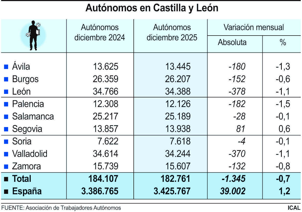 El colectivo de autónomos de Castilla y León se desangra, y especialmente lo hace en León. La Comunidad encabezó la pérdida de trabajadores por cuenta ajena entre las autonomías españolas en 2025, cuando perdió un total de 1.345 autónomos, hasta los 182.761, un 0,7 por ciento menos. Solo otras tres autonomías vieron mermar al colectivo, La Rioja, Aragón y País Vasco, donde descendieron un 0,9 (220 menos), un 0,4 por ciento (-421), y un 0,3 por ciento (-510), respectivamente. En el conjunto nacional, el régimen de autónomos creció un 1,2 por ciento y sumó 39.002 trabajadores por cuenta propia, hasta los 3,42 millones.