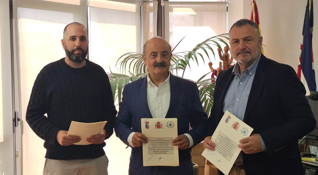 El presidente de la CHMS José Antonio Quiroga, junto al alcalde de Camponaraya, Eduardo Morán, y el pedáneo de Magaz de Abajo, Jonathan López, rubricó el convenio para ese nuevo paso que conectará Narayola con Cacabelos.