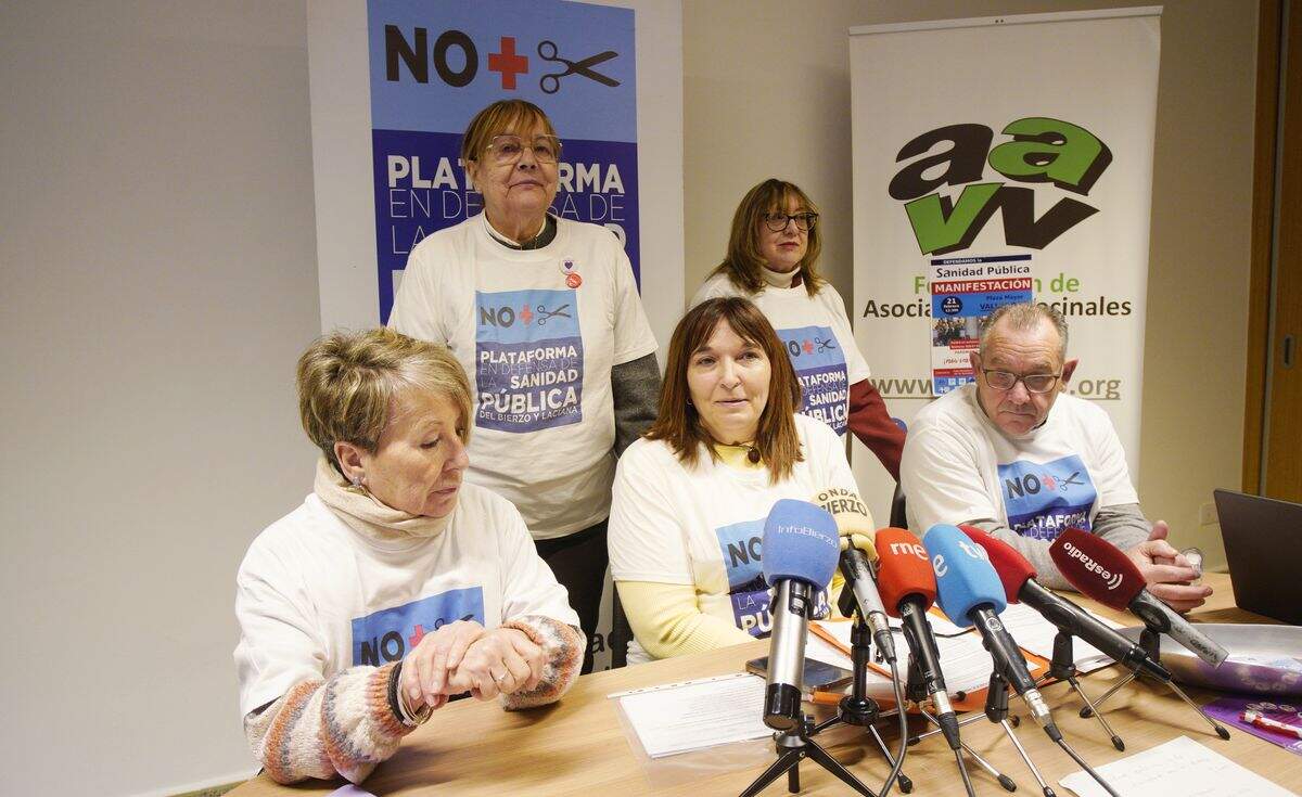 Los componentes de la Plataforma en defensa de la Sanidad Pública del Bierzo y Laciana, durante su comparecencia en rueda de prensa para hablar de la situación sanitaria en ambas comarcas. Foto: César Sánchez.