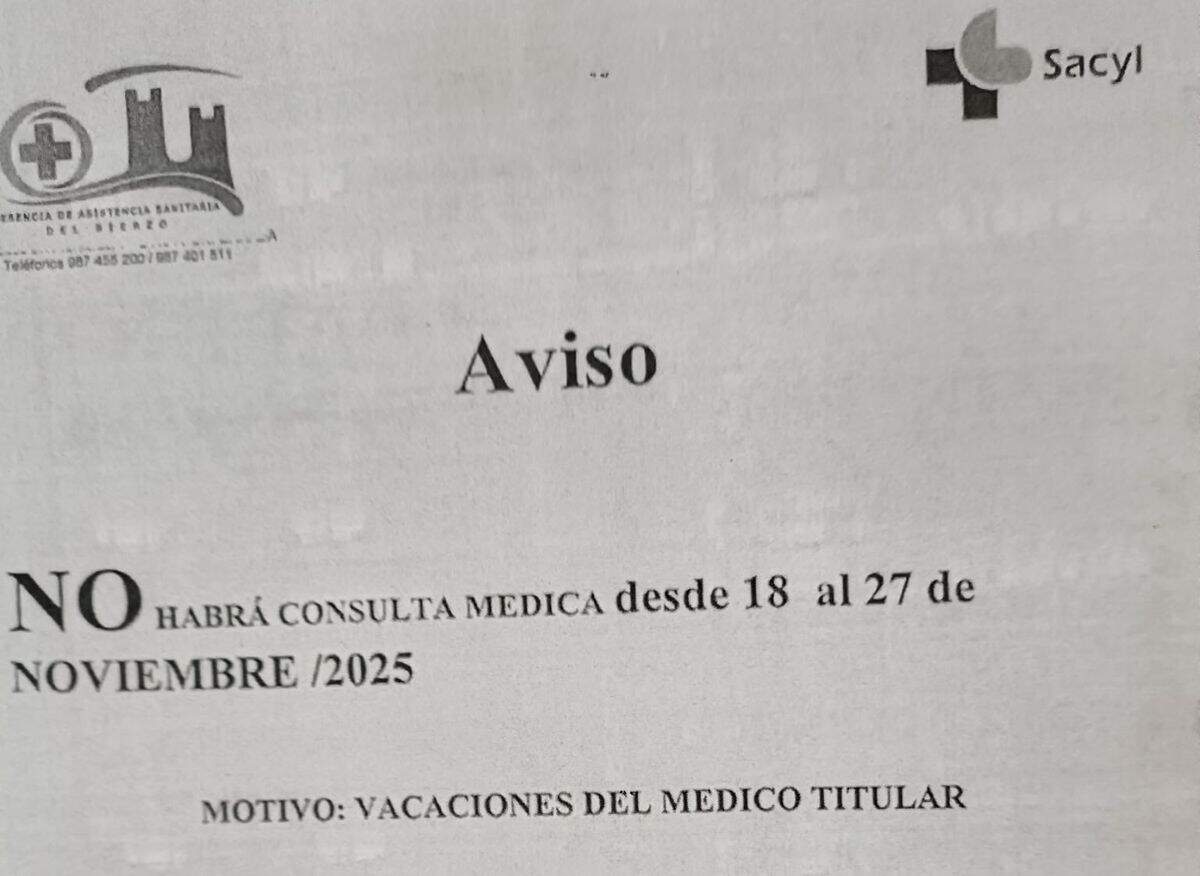 "El municipio de Molinaseca se encuentra nuevamente sin servicio sanitario debido a las vacaciones del médico titular, un derecho que, como es lógico, debe poder disfrutar. No obstante, en esta ocasión tampoco se ha previsto una sustitución para cubrir esos días". Esta es la denuncia que ha hecho este viernes Coalición por El Bierzo tras constatar que "el consultorio médico volvió a cerrarse sin previo aviso, y solo después de que algunos vecinos expresaran su preocupación se colocó un cartel informando de que permanecería sin servicio del 18 al 27 de noviembre".