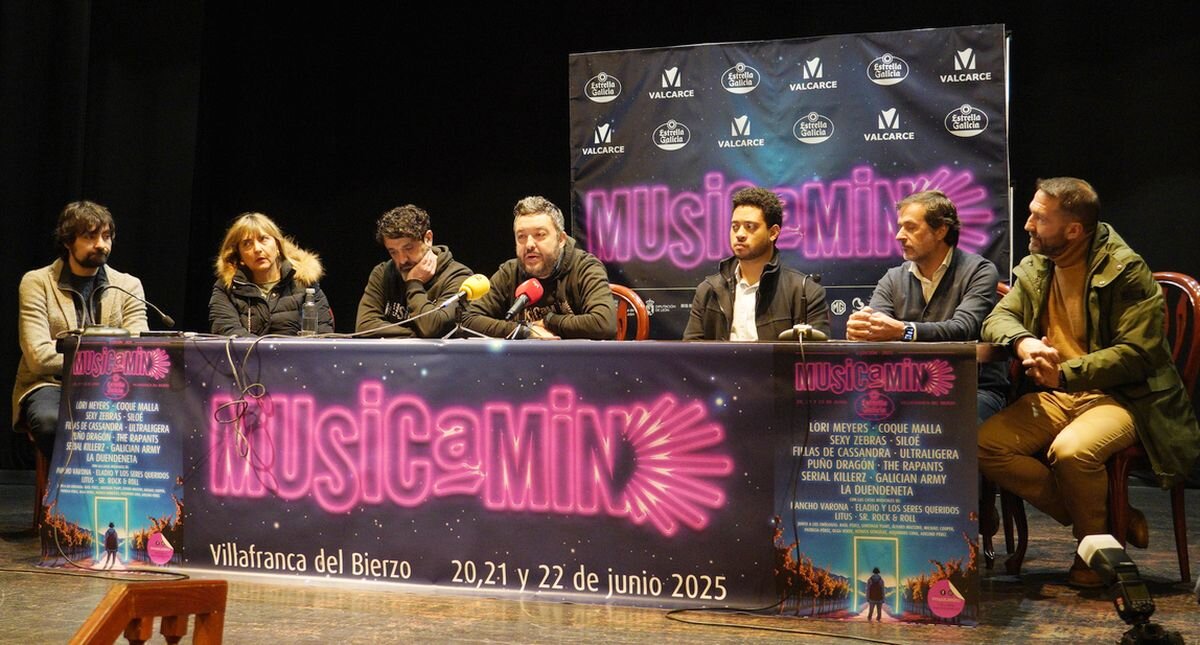 El alcalde de Villafranca del Bierzo, Anderson Batista, junto al coordinador de proyectos del Instituto Leonés de Cultura, Emilio Gancedo; el presidente de la DO Bierzo, Adelino Pérez, y representantes de la organización del festival y de la Zona Norte de Estrella Galicia, durante la presentación de la II edición del Festival Musicamino que se celebra en la localidad en junio. Foto: César Sánchez.