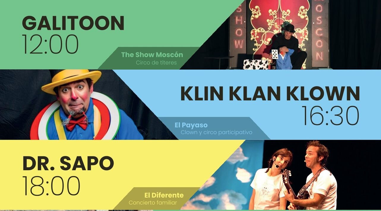 Por la tarde, a las 16:30 horas, será el turno para Klin Klan Klown, con su propuesta ‘El Payaso’ en el que el personaje principal representa la libertad y la anarquía del mundo infantil. Un espectáculo de teatro y circo gestual, interactivo y participativo, con números de mímica, magia, malabares y música.  A las 18:00 horas, Dr. Sapo llega con el espectáculo musical ‘El Diferente’, basado en el libro del mismo nombre, y que narra, con tintes de humor y magia, la historia de un extraterrestre atrapado en la Tierra.