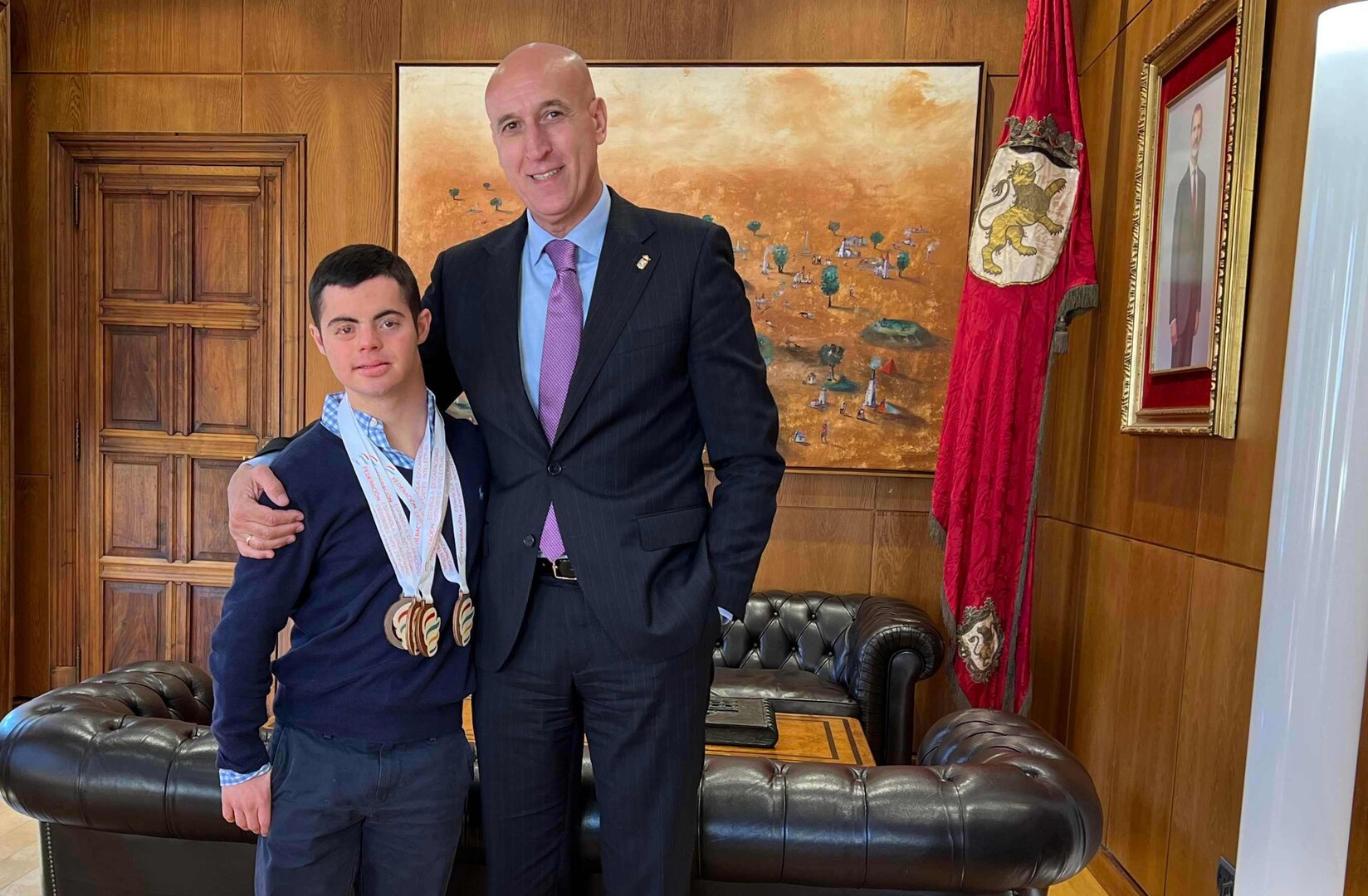 El alcalde de León, José Antonio Diez, ha recibido este jueves a Pablo Miguel Rodríguez, el leonés síndrome de Down, del club CN La Venatoria, que ha conseguido subir al pódium con dos platas y dos bronces en el Campeonato de España de Natación FEDDI, celebrado el pasado mes de marzo en las Palmas de Gran Canaria.