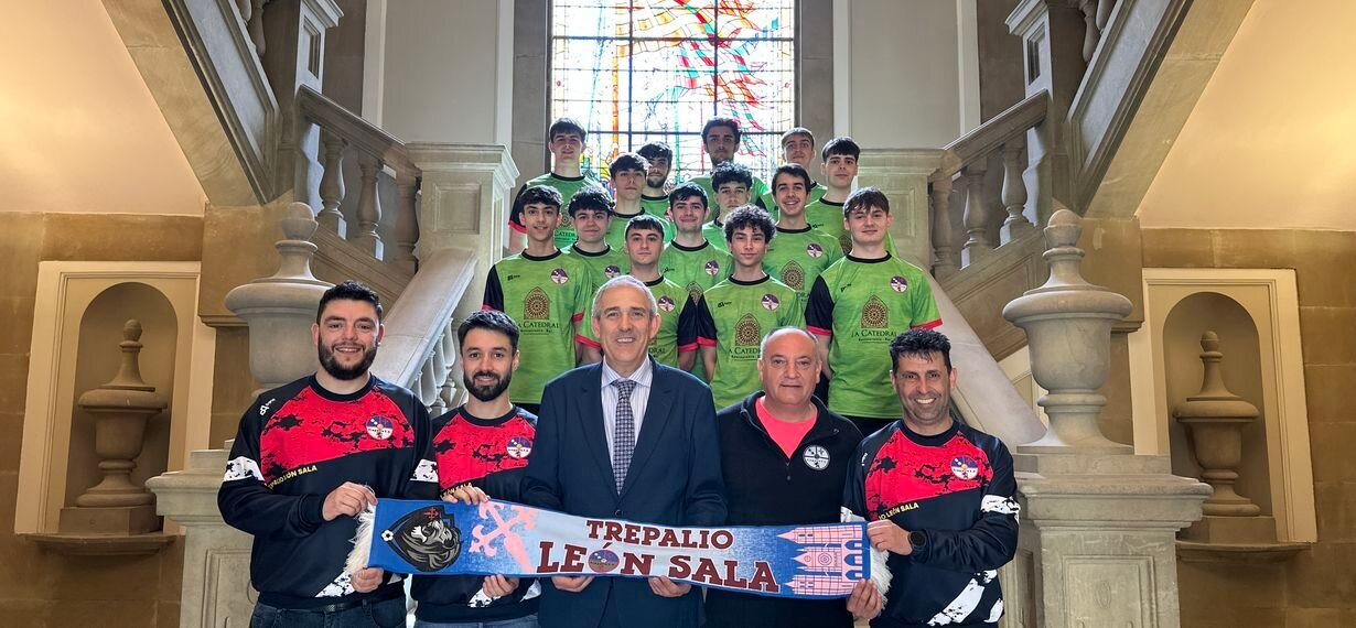 Los jugadores del CD Trepalio participarán entre los días 11 y 13 de abril en la Copa de España juvenil de fútbol sala. Con la ilusión ya desbordada por vivir la aventura, los integrantes del equipo de División de Honor Juvenil han acudido al Ayuntamiento de León donde les ha recibido el concejal de Deportes, Vicente Canuria, para desearles suerte en la competición que se celebrará en Murcia. "Recordad que llegar aquí ya es un premio, pero os esperamos a la vuelta para celebrar el triunfo", les ha animado Canuria.