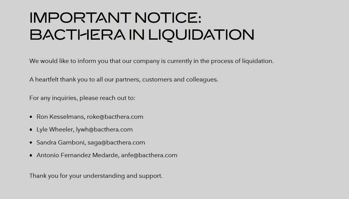 En un comunicado Bacthera anuncia la reestructuración corporativa y reordenamiento de prioridades de fabricación.
