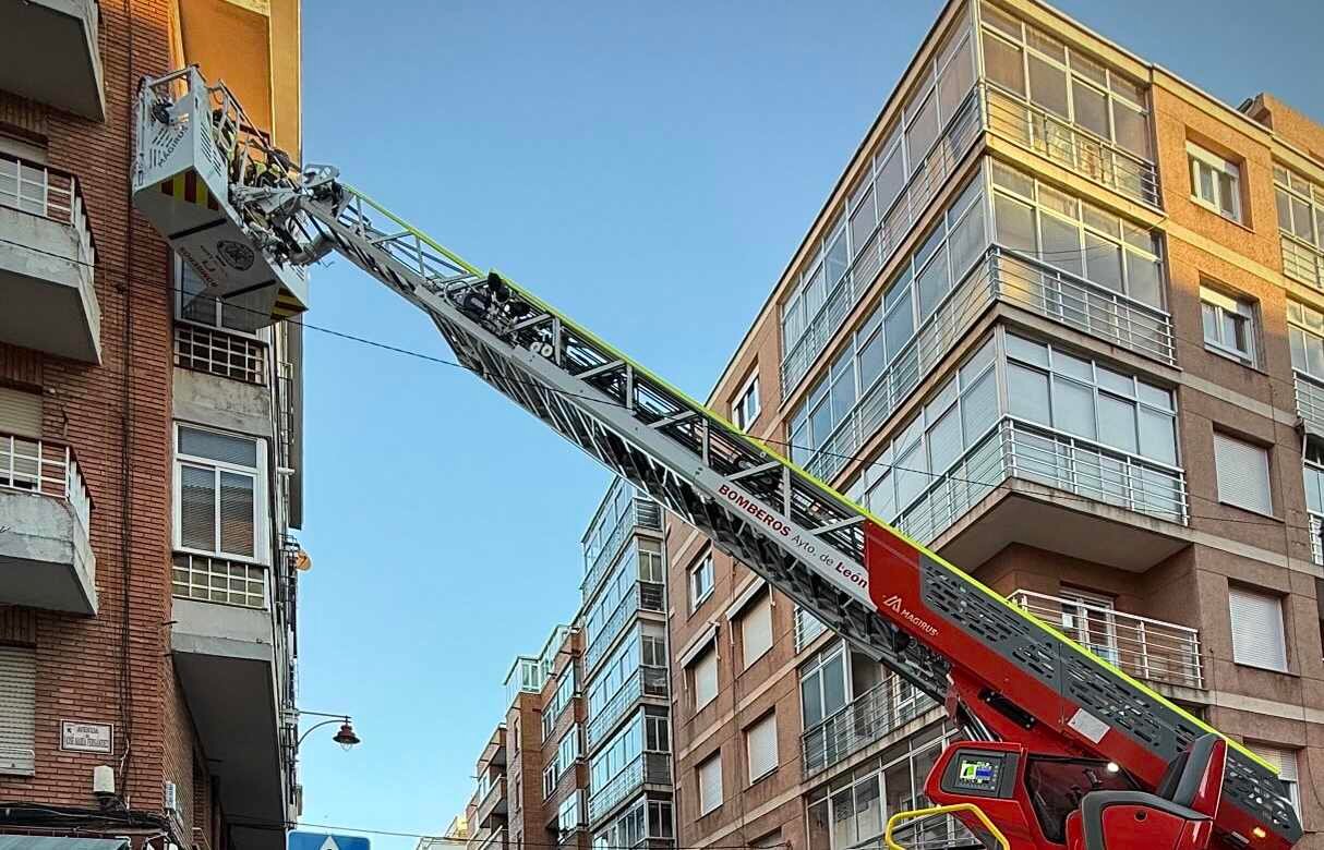 Los Bomberos de León revisan una fachada tras un desprendimiento en el cuarto piso