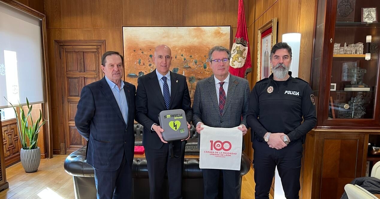 El presidente de la entidad, Ángel Luis Valdés Álvarez, y el gerente, Miguel Ángel Sánchez Fraile, formalizaron la donación del equipo de reanimación cardíaca en presencia del alcalde de León, José Antonio Diez, y del intendente jefe de la Policía Local del León, Miguel Ángel Llorente, coincidiendo con el 100 aniversario de la Cámara de la Propiedad.