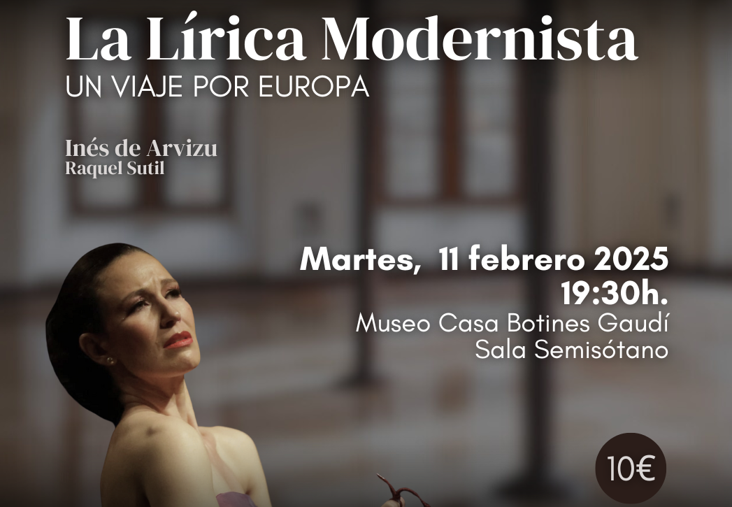 Este ciclo de actuaciones se inaugura con la voz de la soprano Inés de Arvizu, acompañada al piano por Raquel Sutil. Bajo el título ‘La Lírica Modernista. Un viaje por Europa’, el primer concierto de ‘Clave Gaudí’ tendrá lugar el próximo martes 11 de febrero a las 19.30h en el Semisótano de Casa Botines (acceso por c/ Pilotos Regueral). Las entradas pueden adquirirse en taquilla o en la web de Casa Botines (https://www.casabotines.es/producto/concierto-la-lirica-modernista/).