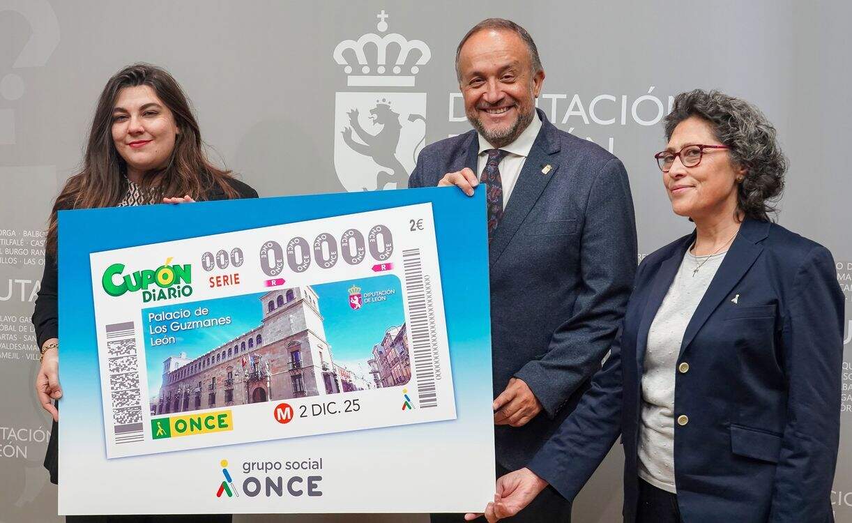 El presidente de la Diputación de León, Gerardo Álvarez Courel, ha acompañado en la presentación de este cupón a la consejera territorial de la ONCE en Castilla y León, Mª Ángeles Ramos del Pozo, y a la directora de la entidad en León, María Quindós Nistal, a las que ha trasladado que “es todo un honor para la Diputación de León que la ONCE haya elegido la fachada de esta institución para ilustrar cinco millones de cupones del próximo 2 de diciembre”.