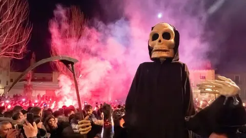Entre antorchas, la procesión contará con figuras emblemáticas como los cuatro cabezudos que representan a los evangelistas, la figura imponente de la muerte y tres pasos portados por los cofrades: la cuba de orujo, la Moncha y la icónica imagen de Genarín abrazado a una farola.