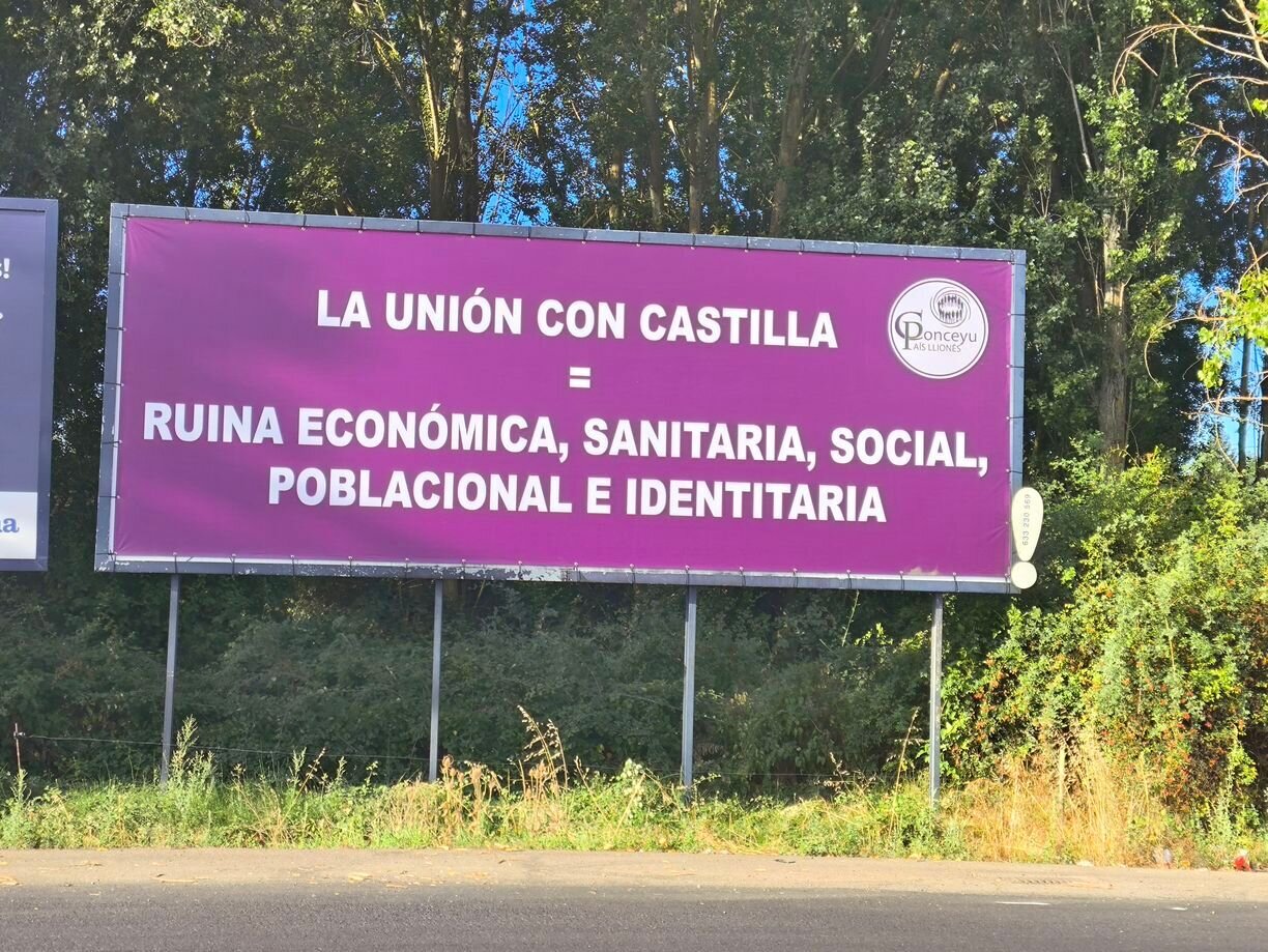 Conceyu País Llionés ha instalado dos vallas reivindicativas con el mismo texto en Ponferrada (con fondo azul) y en León (con fondo púrpura) poniendo en evidencia, lo que la Junta, representa para el País Leonés, tras estos más de 42 años: “La Unión con Castilla=Ruina económica, sanitaria, social, poblacional e identitaria”.