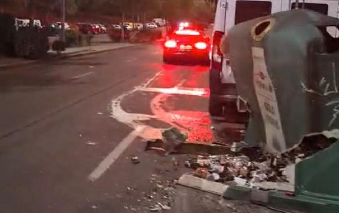 El turismo impactó con fuerza contra cuatro contenedores, uno de ellos destinado a la recogida de vidrio, que quedó completamente inutilizado. El resto fueron desplazados varios metros sobre la acera debido a la violencia del golpe. También resultó afectada una furgoneta que se encontraba estacionada en las inmediaciones.