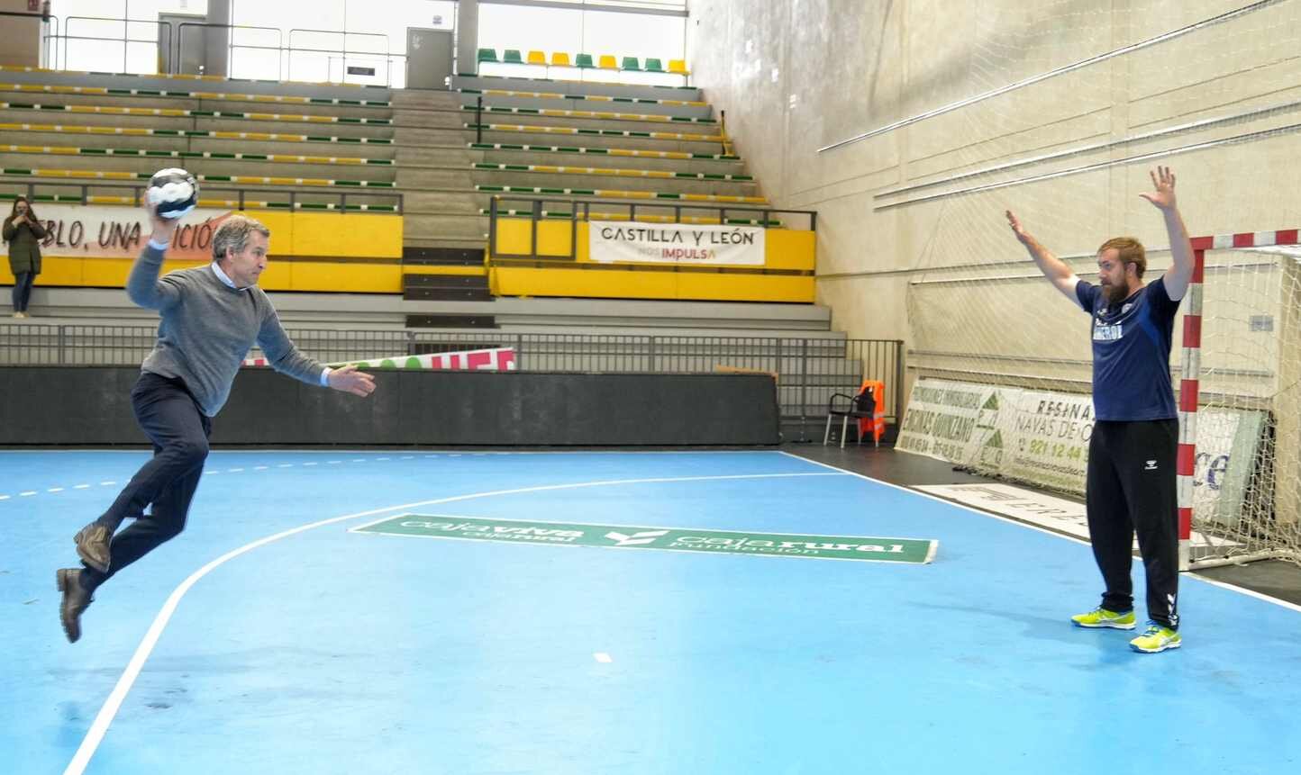 La visita coincidió con un entrenamiento del Viveros Herol Balonmano Nava, equipo que compite en la Liga ASOBAL, la máxima categoría del balonmano español. Feijóo saludó a los jugadores, conversó con el cuerpo técnico y terminó participando brevemente en la actividad deportiva, balón en mano.