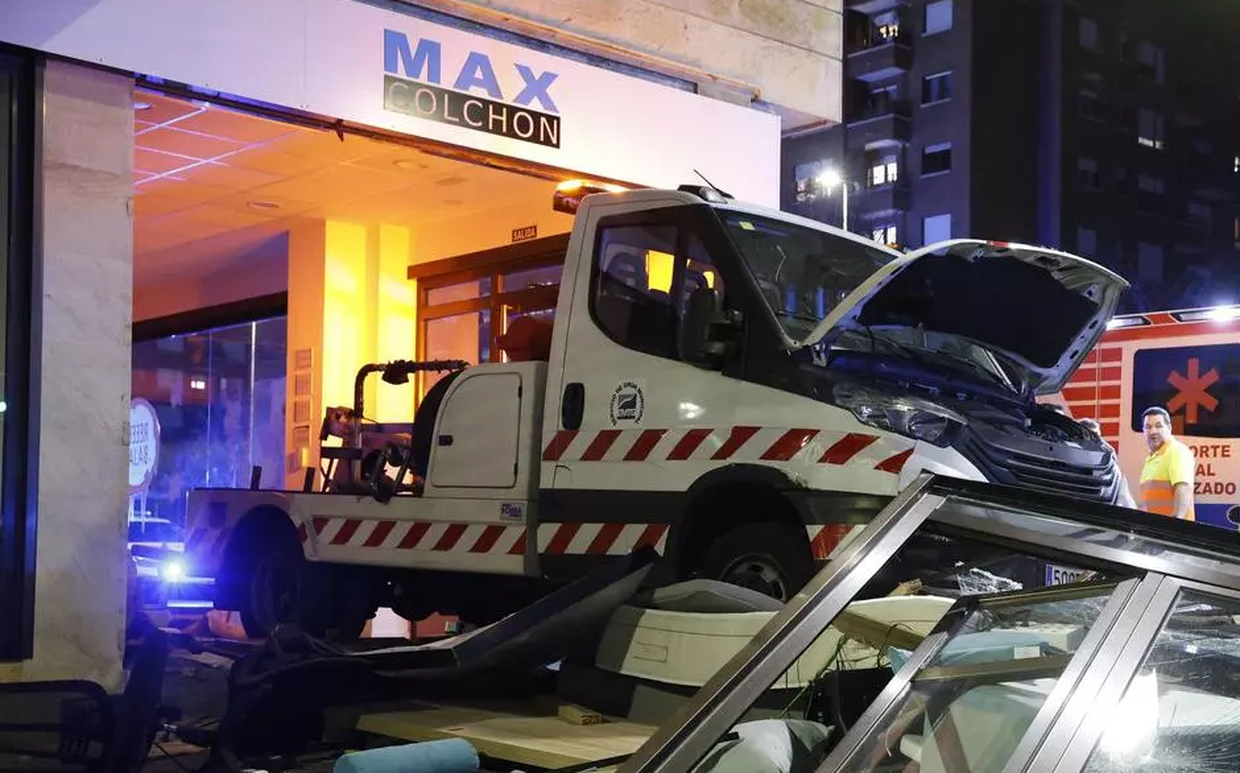 El suceso se produjo poco antes de las diez de la noche, cuando el vehículo pesado, que transportaba una furgoneta sobre el remolque, circulaba en sentido hacia el centro de la ciudad. Por causas que se investigan, el conductor sufrió una indisposición repentina, lo que provocó que la grúa se desviara de su trayectoria, invadiera la acera y terminara empotrándose en una tienda de colchones próxima al El Corte Inglés.