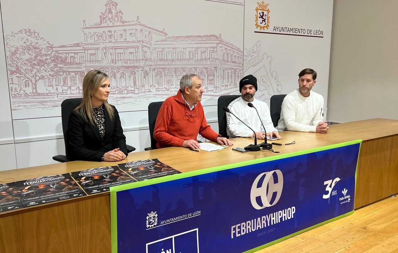 El concejal de Deportes del Ayuntamiento de León, Vicente Canuria, acompañado por Fran Leal y Borja Vilanova, organizadores del evento, y Elena Sandoval, en representación de Caja Rural, ha presentado este jueves una nueva edición de 'February Hip Hop', la Convención Internacional de Danza Urbana, que se celebrará en la ciudad los días 14, 15 y 16 de marzo.