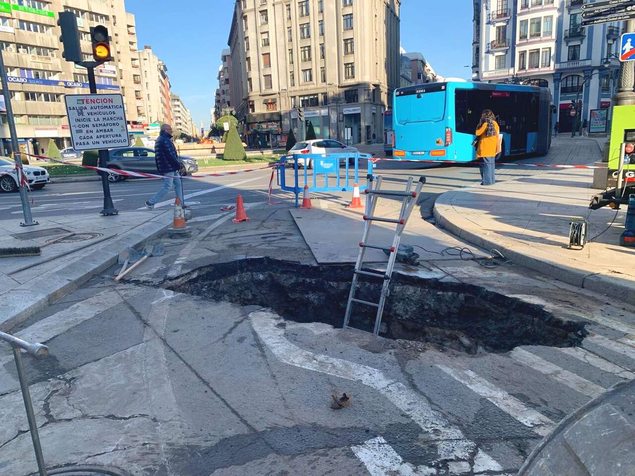 En la mañana de este jueves, un gran socavón sorprendió a quienes transitaban por la céntrica plaza de Santo Domingo. Este hueco, que se abrió a varios metros de profundidad justo en el acceso hacia la plaza de Botines, está vinculado a las labores que lleva a cabo la empresa Aguas de León. Según confirmaron fuentes municipales a Heraldo de León, se trata de trabajos para reparar una rotura en una tubería subterránea.