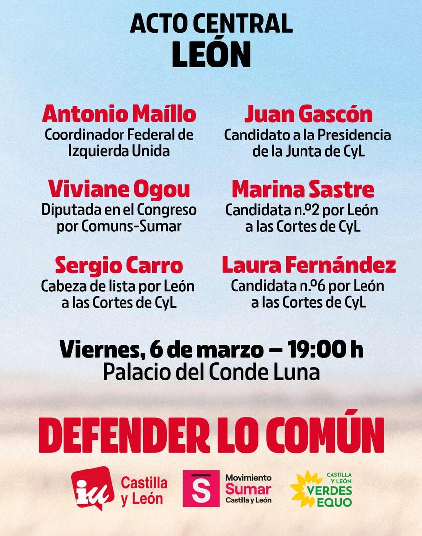 La coalición formada por Izquierda Unida, Movimiento Sumar y Verdes Equo celebrará este viernes en León su acto central de campaña, un encuentro abierto a la ciudadanía que tendrá lugar a las 19:00 horas en el Palacio del Conde Luna.