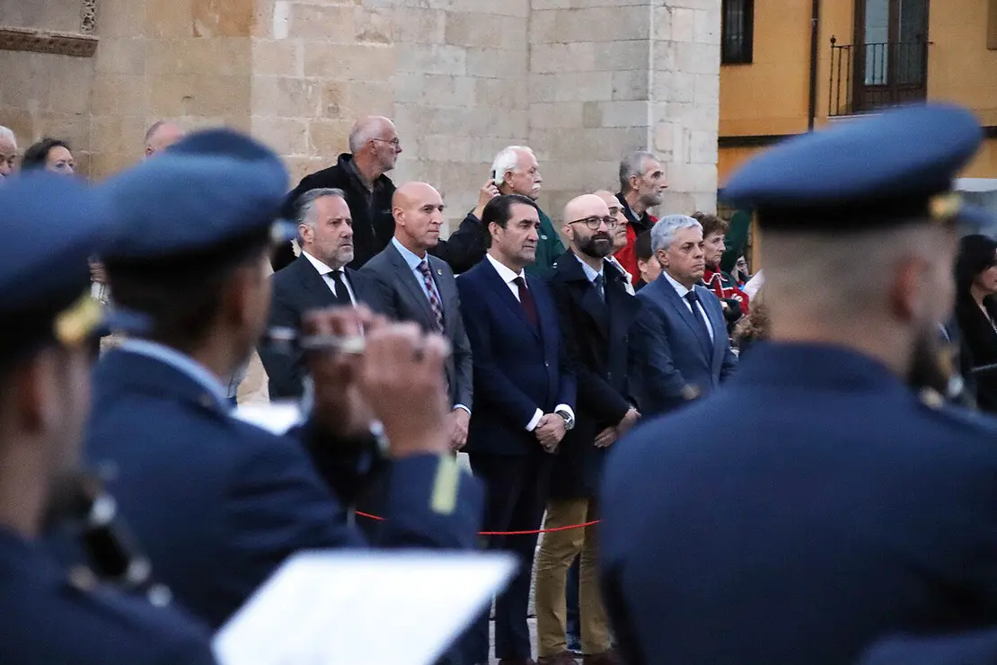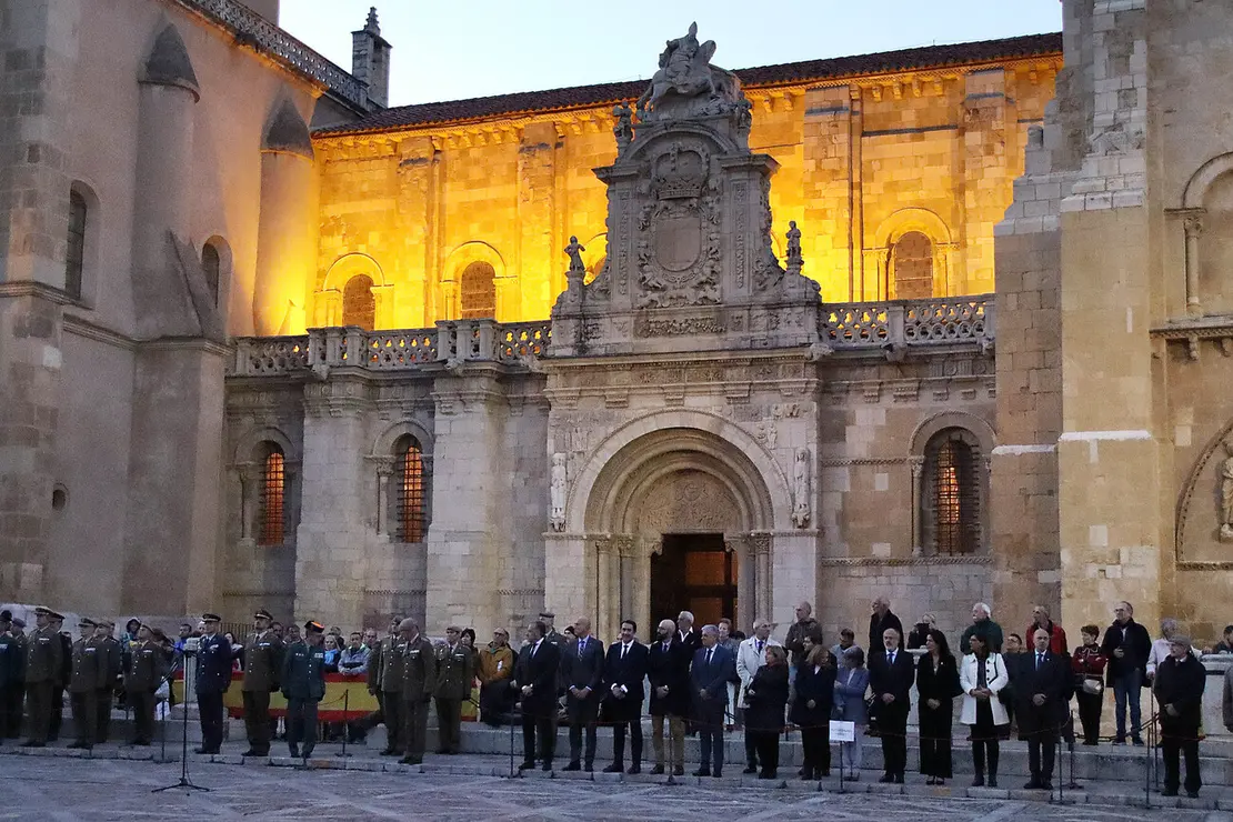 El acto, en el que hubo un recuerdo especial para el caballero o alumno de la Academia Básica del Aire fallecido recientemente, consistió en un arriado de la bandera y un tradicional toque de retreta a cargo de una unidad de honores formada por una escuadra de batidores del Quinto Batallón de Intervención en Emergencias, banda de guerra del Regimiento de Artillería Lanzacohetes de Campaña número 63 de Astorga, Unidad de Música de la Academia General Básica de Suboficiales del Ejército del Aire y del Espacio, una sección del Grupo de Artillería de Campaña II/11 y guiones y banderines de las unidades de las Fuerzas Armadas y de la Guardia Civil de la provincia de León