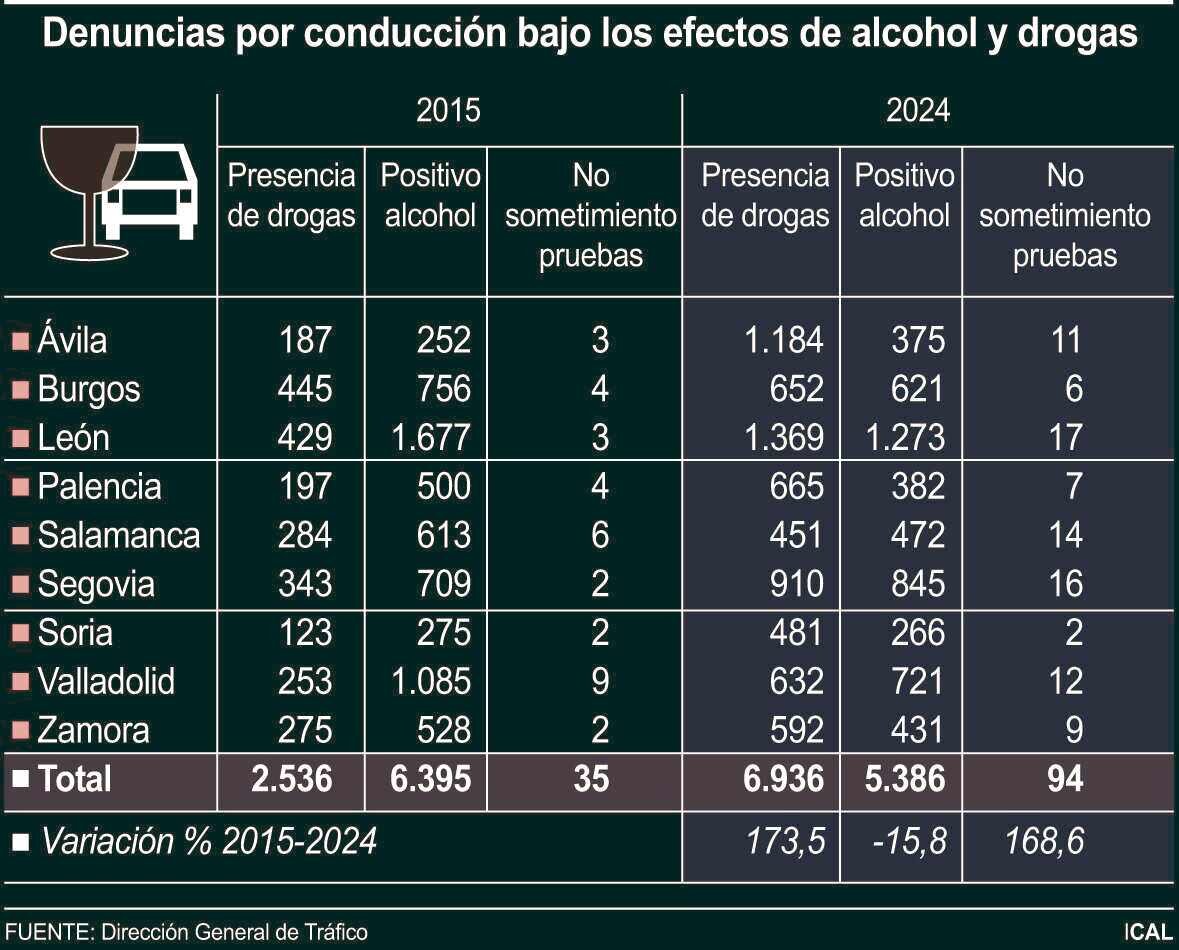 En drogas, después de León aparecen Ávila (1.184) y Segovia (910), mientras que en alcohol el segundo lugar corresponde a Segovia (845), seguida de Valladolid (721).