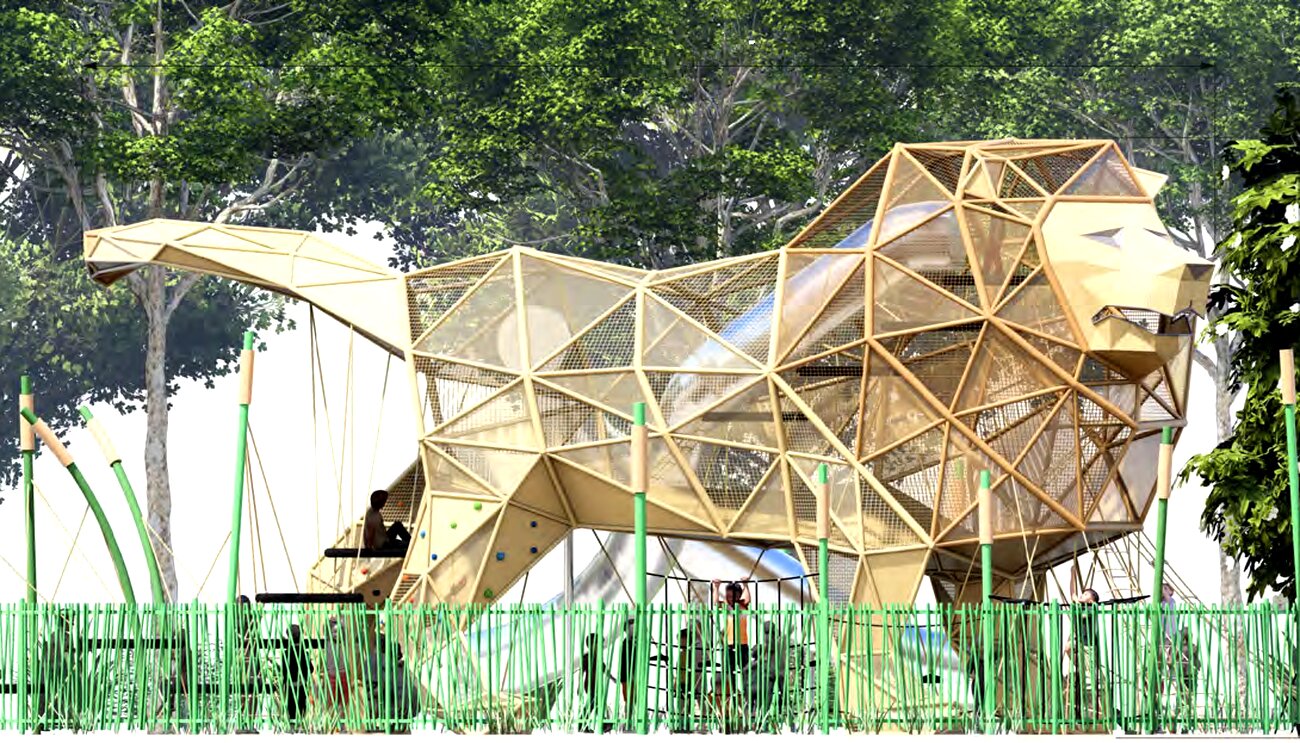 El león será un juego interactivo a gran escala para un público de entre 3 y 12 años. Este incluye trepas, cuerdas, hamacas, arañas, puentes colgantes y catenarias, todo ello dentro de la estructura con forma de león, que estará rodeada de columnas a modo de juncos diseñadas para crear un gran conjunto de juego en una zona de la ciudad carente de este tipo de equipamientos. La dimensión del elemento es de 16,22 metros de largo, por 9,5 de ancho y 6,6 de alto.