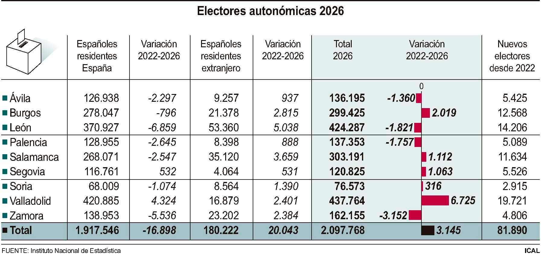 De ellos, 1.917.546 residen en Castilla y León y 180.222 viven en el extranjero, donde los electores podrán ejercer su derecho al voto sin necesidad de solicitarlo previamente. Además, 81.890 jóvenes votarán por primera vez al haber cumplido los 18 años desde las elecciones anteriores.