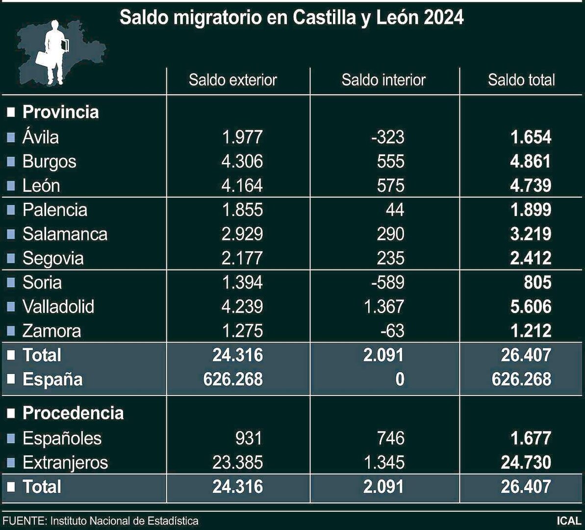 A nivel autonómico, el saldo migratorio exterior fue decisivo: Castilla y León recibió 42.349 personas procedentes del extranjero y solo 18.033 emigraron fuera del país, lo que dejó un balance positivo de 24.316 individuos, más de 1.900 por encima de 2023.