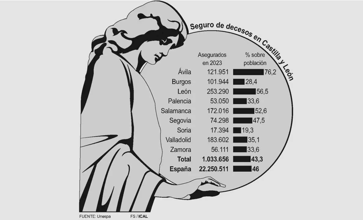 El 43,3 por ciento de los castellanos y leoneses tiene contratado un seguro de decesos. El pasado año las compañías de seguro contabilizaban en la Comunidad un total de 1.033.656 asegurados (253.000 en la provincia de León), un 2,47 por ciento más que hace tres años, según se desprenden de un informe elaborado por la Asociación Empresarial del Seguro (Unespa), en el que se pone de manifiesto que el 46,6 por ciento de los españoles cuenta con una póliza de este tipo.